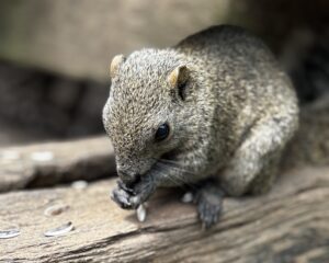 一般的にリスと聞いて想像するリスは、小柄で茶色のシマ模様が特徴的なシマリスだと思うのですが、タイワンリスは色はグレー、耳は丸く、尻尾は太くてモフモフ、サイズは想像のリスより大きいな、と思う大きさで、頭と胴体部分で20cmほどあります。