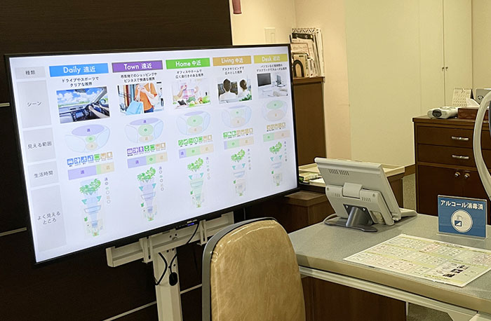 視力測定以外に、調節力測定(ピント合わせの力)や斜位(しゃい)の程度を調べる眼位測定なども行います。お客様の目の状態や、遠近両用・中近両用といった一般的なレンズの種類について、テレビモニターを使いながら丁寧にご説明いたします。