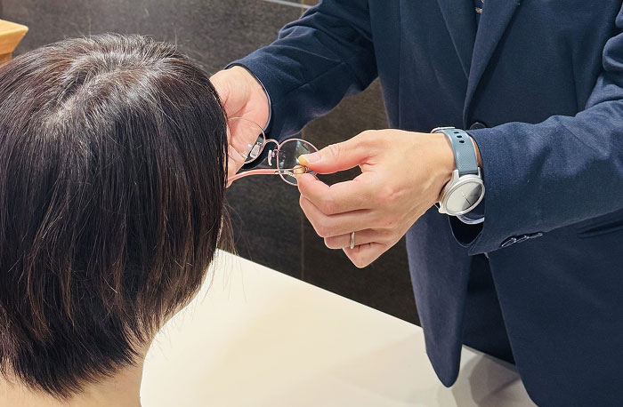 メガネを作製する前に、視力矯正の効果を最大限に引き出し、最適な位置で快適にお掛けいただけるよう、細部まで丁寧に調整します。